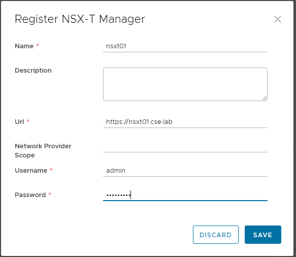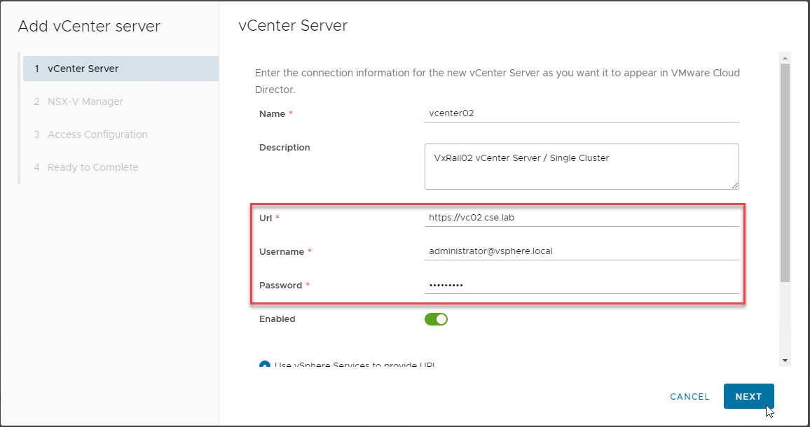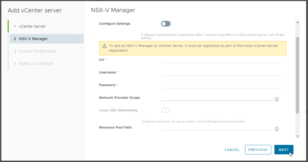In the case of NSX-V, the vCD Portal UI will require the NSX-V details to be entered immediately along the vCenter Server, as shown below: