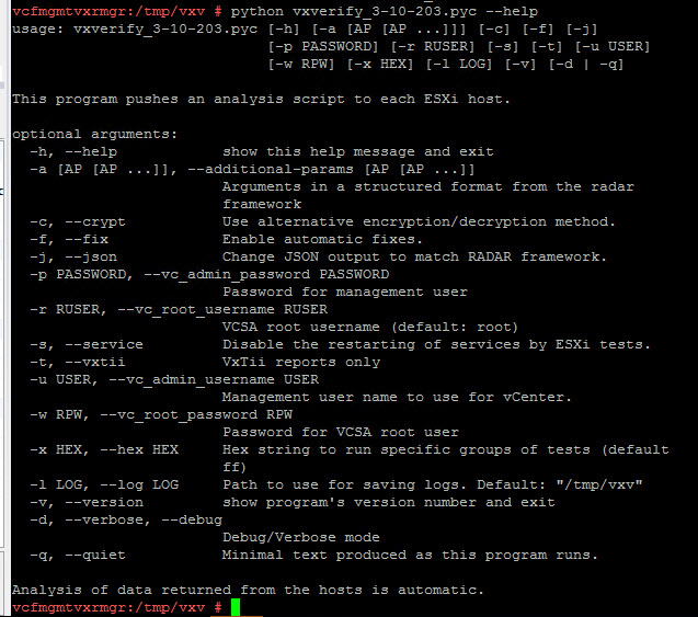 Once uploaded navigate to /tmp/vxv/ and use –help to expose all the VxVerify associated command line arguments: