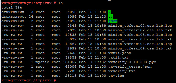 VxVerify creates a number of files in ‘/tmp/vxv/’ these include .log files which can be used for troubleshooting purposes etc. also the summary report seen on the previous screen can be recalled by viewing the ‘/tmp/vxv/vxverify.txt’ file: