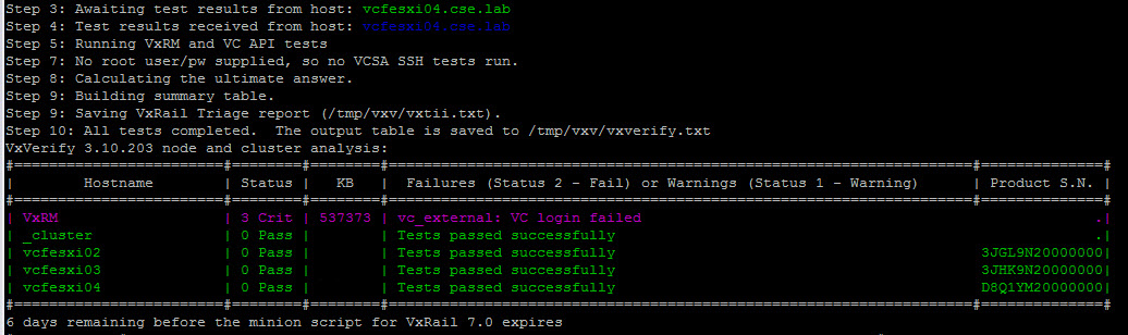 As can be seen from the results table below; all hosts and cluster tests completed successfully. You can also see the status 3 critical alert notifying that ‘VC login failed’ the VC management credentials get decrypted automatically from the VxRail Manager database and runtime (although they can also be specified with -u & -p), so if those are failing, you’ll need to check the vxv.log