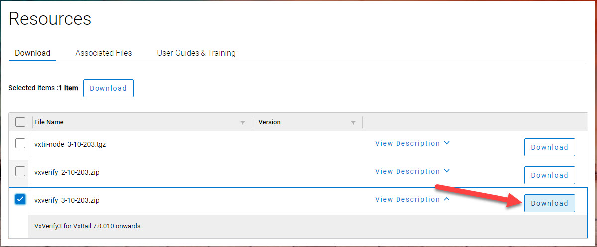In this example VxRail is running code version 7.0.100 so we begin by downloading the VxVerify 3.x edition: