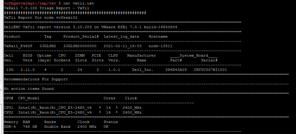 Another really useful output here is the ‘vxtii.txt’ file which includes detailed information on each ESXi host in the VxRail cluster providing a nice overview of the hardware: