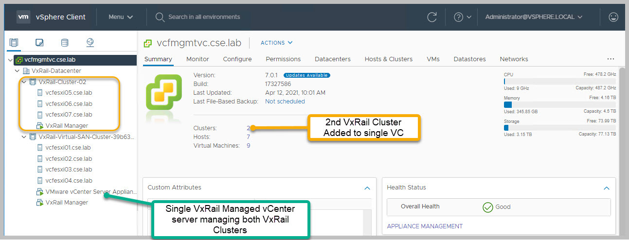 After the initialization of the second VxRail cluster we now have a single VxRail Managed vCenter server instance managing multiple VxRail clusters. With the first initially deployed VxRail Manager handling the life cycle management of the single vCenter server.