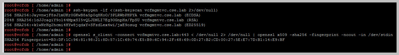 - openssl s_client -connect vcfmgmtvc.cse.lab:443 < /dev/null 2> /dev/null | openssl x509 -sha256 -fingerprint -noout -in /dev/stdin