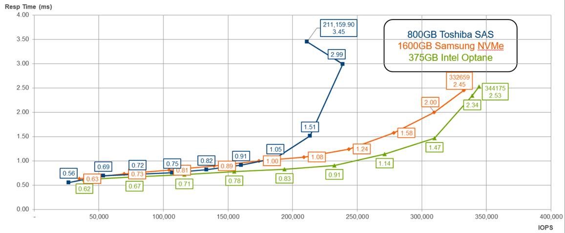 The biggest reason Optane is justifiable and why the size of these drives is of slightly less concern is the performance of the drives compared to SAS and NVMe caching disks. As you can see on the performance chart below we are netting 25-30% lower latency than NVMe drives and is sustained as the load increases. From a vSAN perspective, because these drives perform so well they are able to handle the de-stage from cache to capacity with less latency than SAS and NVMe so they really make up for the smaller capacity in a variety of different ways.