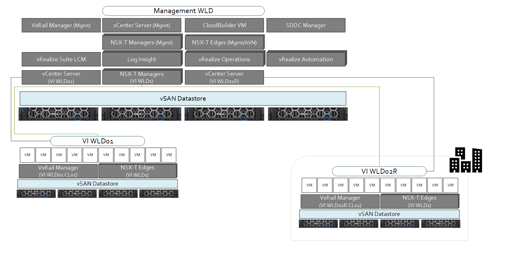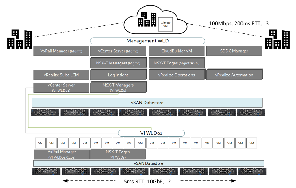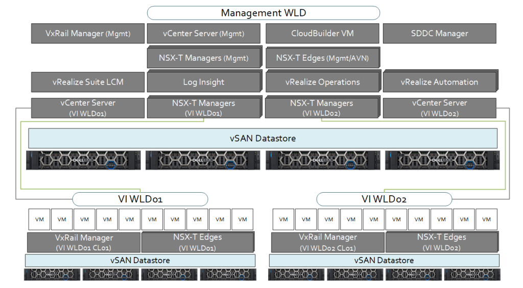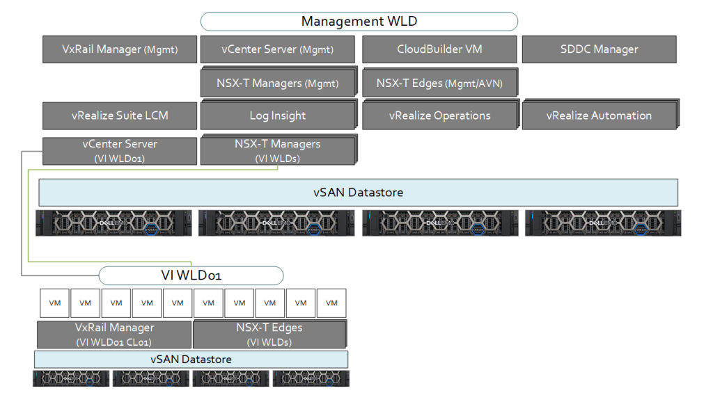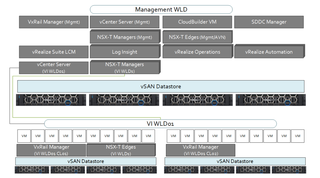 - All Management WLD and VI WLD vCenter Server and NSX-T Manager instances are located in Management WLD