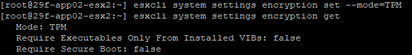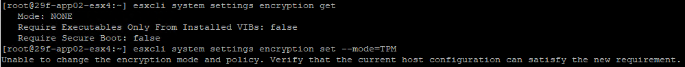 On each host, using esxcli, I also made sure that the system settings encryption mode was set to TPM: