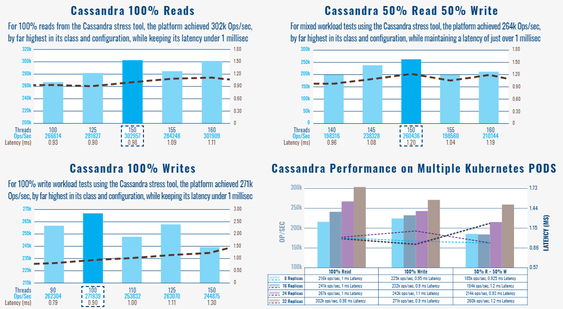 - Over 260,000 ops/sec for mixed workloads of 50 percent reads and 50 percent writes, with median latency of 1.2 milliseconds at 150 threads.