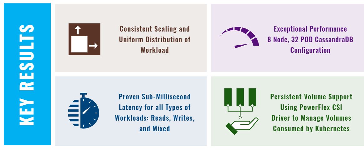 All the results show that PowerFlex family offers superior performance, scalability, and reliability in an 8-node, multiple Cassandra POD configuration. Testing also supports the idea that if your real-time data is growing exponentially, this optimized platform “Dell EMC PowerFlex family”, KIOXIA SSDs, Kubernetes, and CassandraDB is the preferred and most robust solution. Testing highlighted that CassandraDB’s performance on the PowerFlex family, orchestrated by Kubernetes, can offer new levels of reliability, flexibility, and performance.