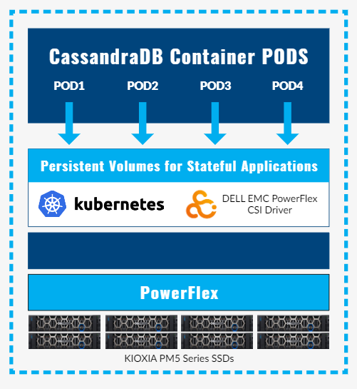 Cloud Evolutions tested and verified that the PowerFlex platform is a high-performance solution both resilient and highly scalable. The objective of the testing conducted by Cloud Evolutions was to bench-mark performance of the PowerFlex Software Defined Storage platform with KIOXIA PM5 Series SAS SSDs, with Kubernetes orchestrating stateful applications on its platform.