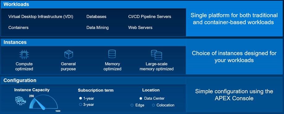 Services and Support are also included as the ProSupport Plus and ProDeploy Plus offerings. All additional VMware Software, OS software, etc. is at the responsibility of the customer and is not included in the APEX Private Cloud 1 or 3 yr subscription pricing.