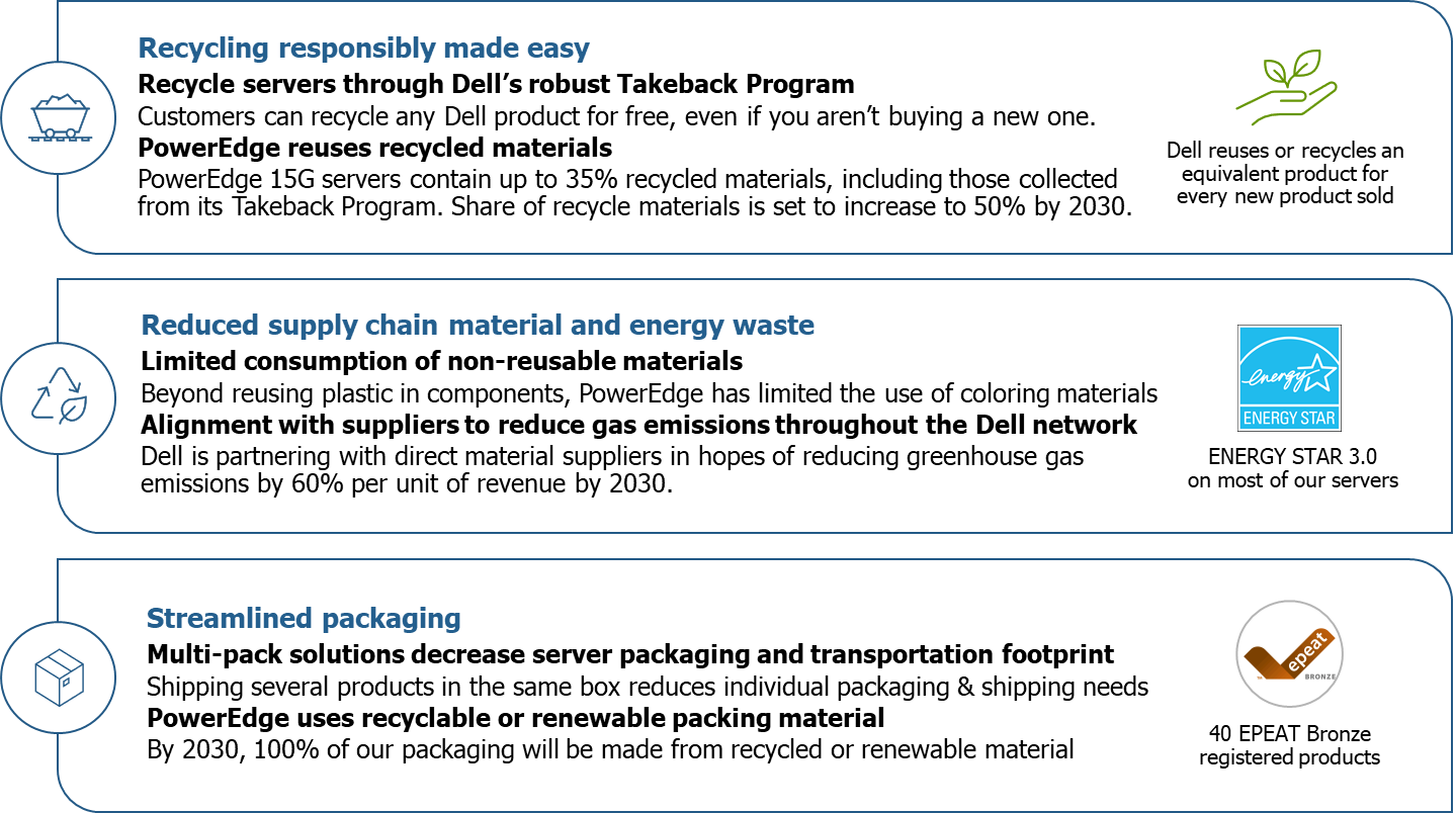 Unlike software, server hardware requires physical materials to be produced and packaging to be delivered. Therefore, to ensure their sustainability throughout their lifecycle, server engineers must evaluate the environmental impact of their products beyond energy consumption and address supply chain considerations like materials and recycling. That’s why PowerEdge 15G has gone three steps further with the following creative solutions in and outside the box: