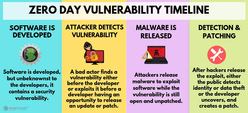 A zero-day exploit hits after a network vulnerability is announced but before a patch or solution is implemented. Attackers target the disclosed vulnerability during this window of time. Zero-day attackers will jump at a disclosed vulnerability during a small window of time where no solution or preventative measures exist at that moment. To prevent zero-day attacks requires constant monitoring, proactive detection, and agile threat management practices.