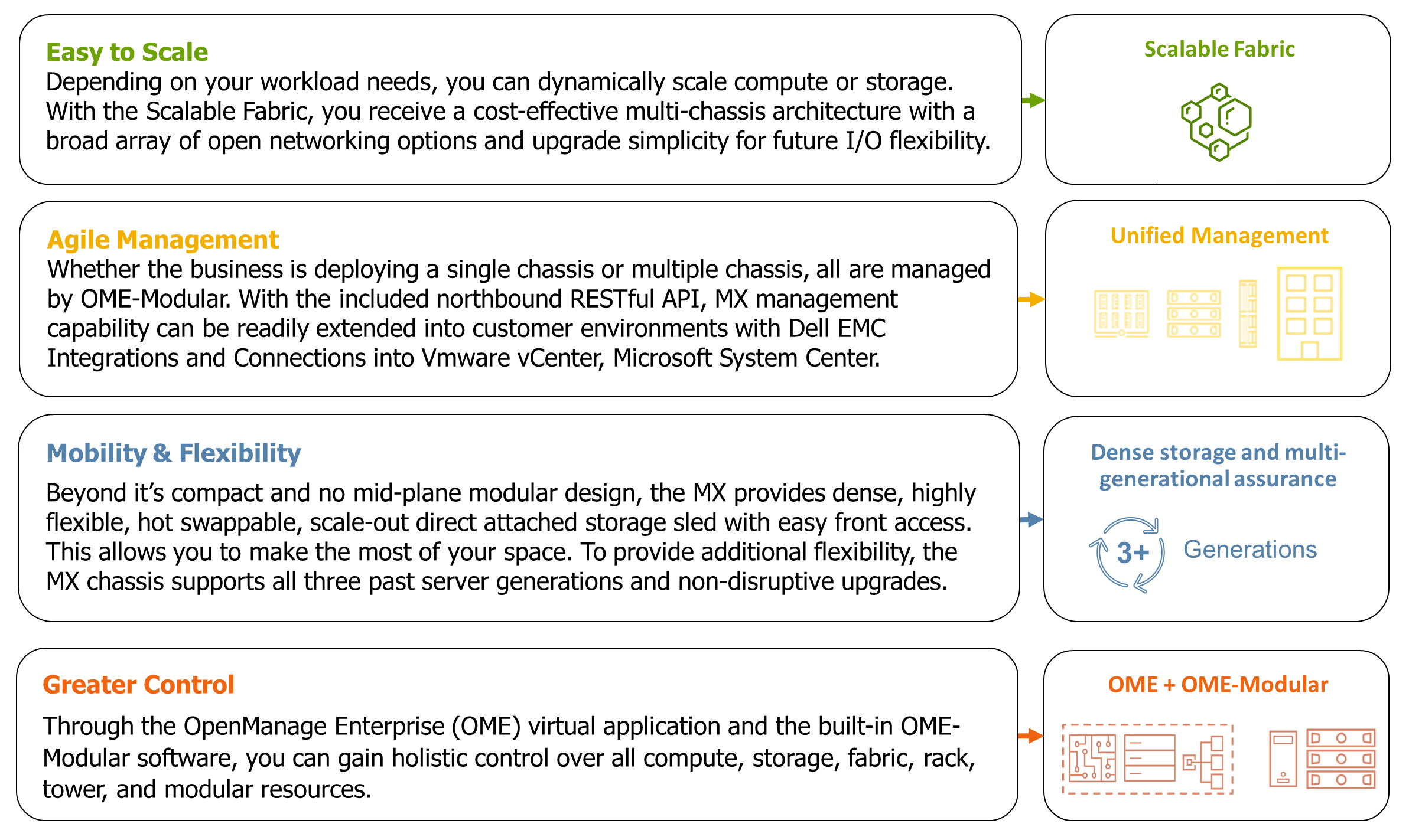 Like other modular solutions, the MX centralizes the management of critical resources by housing blade servers in a chassis, as opposed to rack and tower servers, where each server typically operates as a stand-alone system. As an overview, the MX ecosystem consists of the famous MX7000 chassis that we initially spoke about, which hosts flexible blocks of server and storage resources and provides outstanding efficiency through shared power and cooling, all managed by Dell EMC OpenManage Enterprise-Modular Edition (OME-Modular). Through this flexible architecture, the MX can help solve key operational and scalability challenges that are typically associated with traditional data centers.