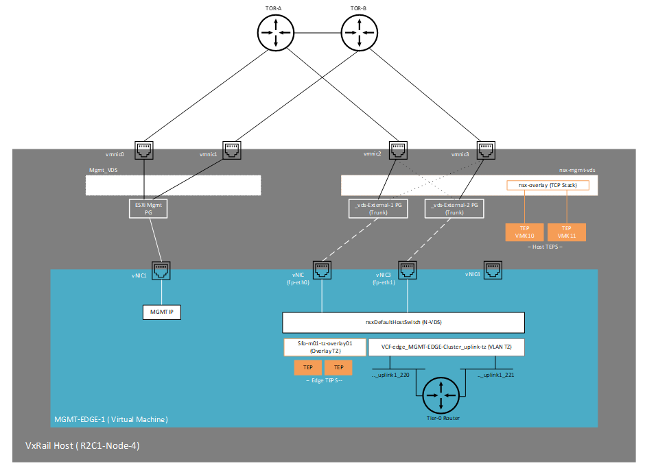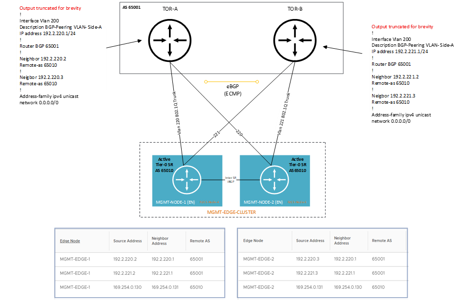 - Each Edge Virtual Machine is then configured with VLAN uplinks for BGP peering. One to each TOR switch (as per Figure 4 below). In our design, they are VLAN 220 and 221. These reside on our second unused VDS that we configure during the ‘Bringup’ process (nsx-mgmt-vds)