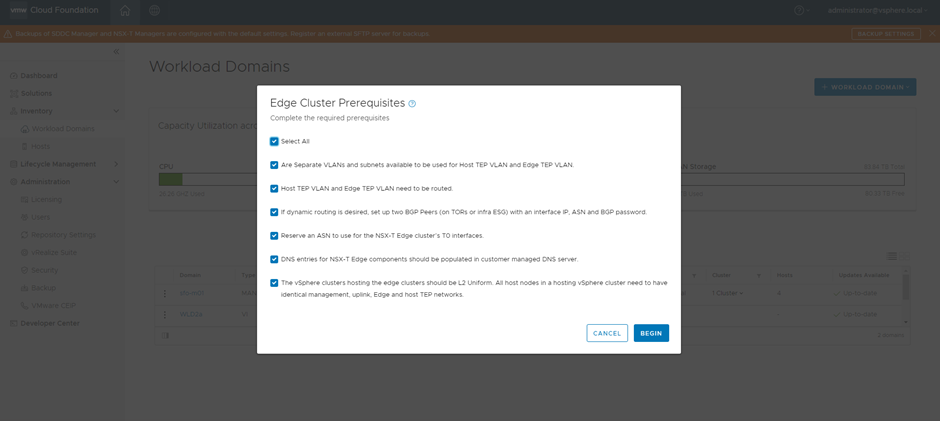 From here we are presented with another checkbox menu, where we are asked to complete Edge Cluster Prerequisites before we can proceed further. This is where we need to begin to understand what the desired outcome will look like. In most scenarios we will want to run a dynamic routing protocol such as BGP to manage dynamic failover and automatically inject AVN address space into the routing table upon creation. We ‘Select All’ to continue.