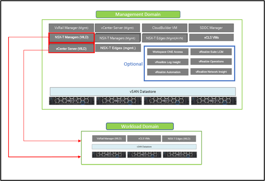 The below diagram shows an overview of the components that make up a typical VCF on VxRail standard architecture, with one management domain (minimum 4 hosts) and one VI workload domain (minimum 3 hosts).