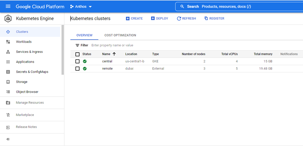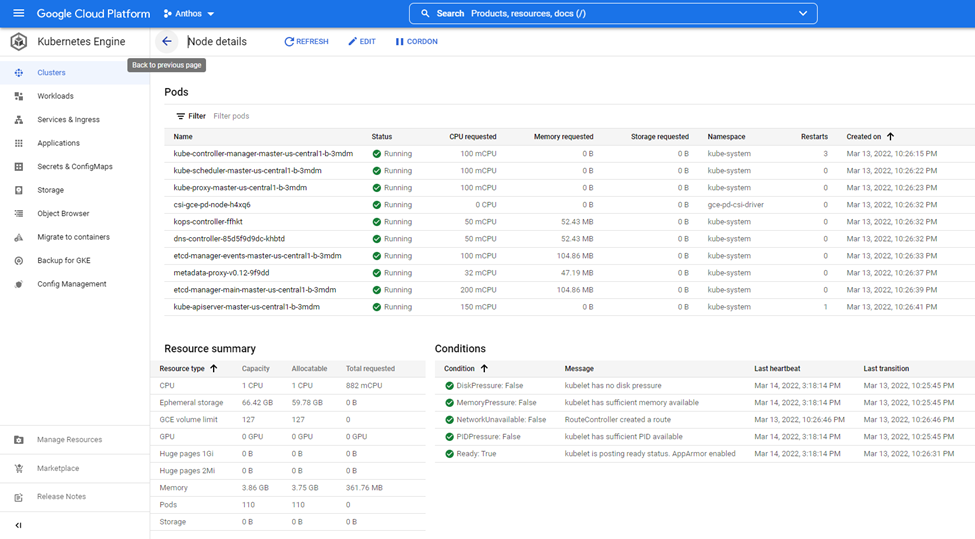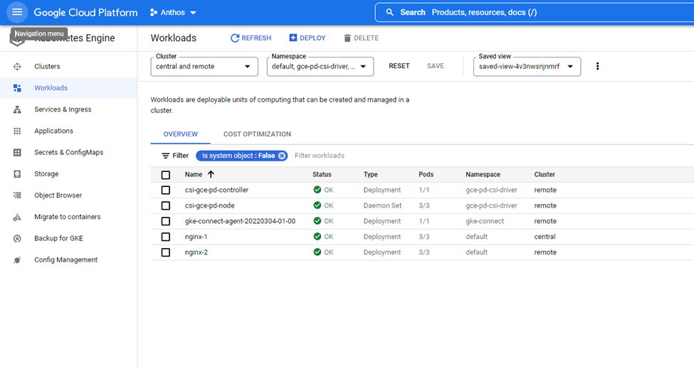 After completing the Anthos on vSphere deployment, the Kubernetes cluster can be managed from the GCP portal. The following screenshots highlight the system deployment from the GCP portal.