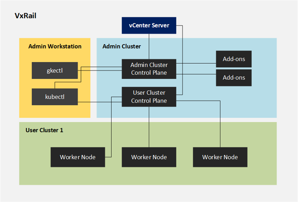 - Admin cluster control plane: The admin cluster’s control plane includes the Kubernetes API server, the scheduler, and several controllers for the admin cluster.