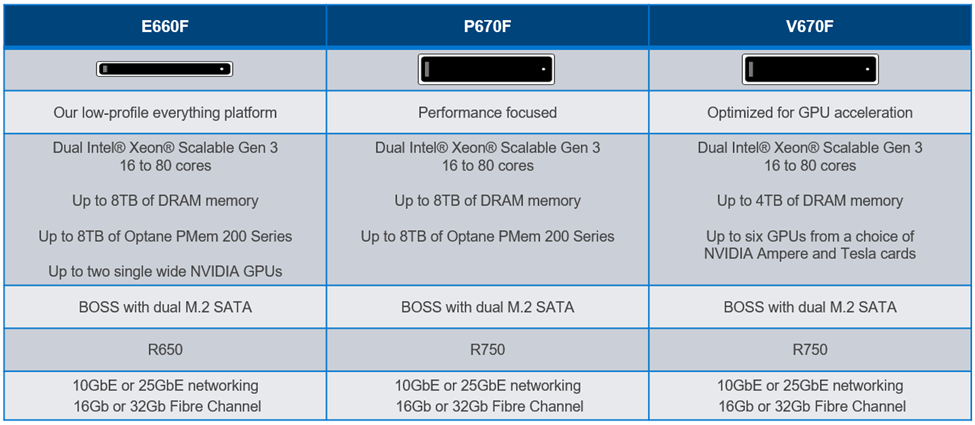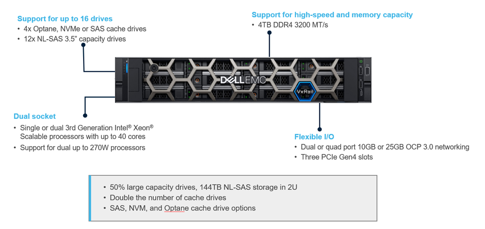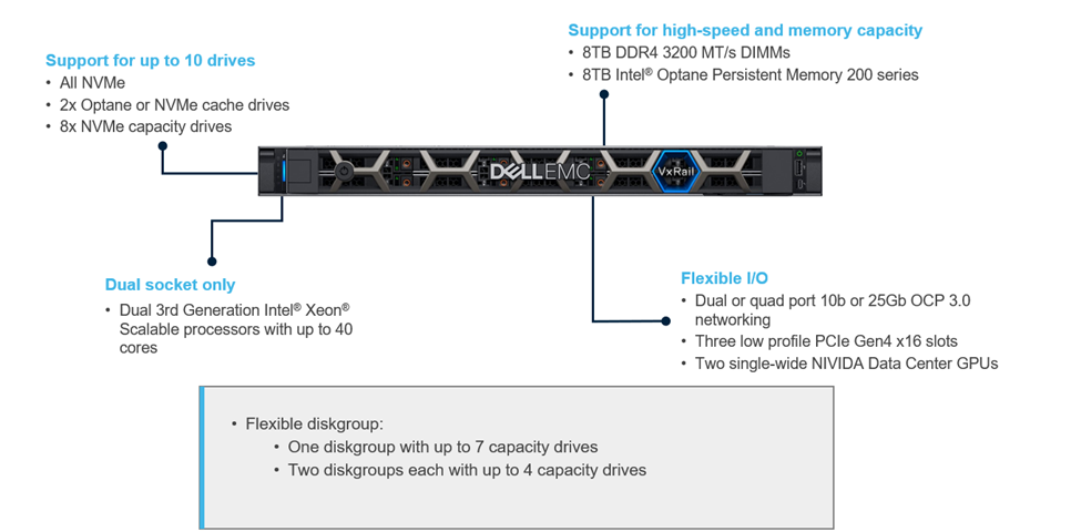 In February, we released VxRail code version 7.0.320 which is based on ESXi 7.0U3c inclusive of the log4j fix, as well as many other 7.0U3 features. This release was available for all existing VxRail customers that are on 13G, 14G and 15G hardware and is accessible through the Dell Technologies Support Site. As part of our 7.0.320 rollout, on March 15th we released this version to factory and introduced 5 new models that provide more configuration flexibility on our latest 15th generation PowerEdge server platform. Of these 5 new models, 2 of them are vSAN enabled node options and the remaining 3 are the 15G versions of our new Dynamic Nodes which provide a compute only ESXi host option for customers who would like to leverage external storage as primary storage. Currently for Dynamic Nodes with code version 7.0.320, we only support leveraging vSAN HCI Mesh and Dell EMC PowerMax, PowerStore PowerFlex and Unity XT storage arrays for external primary storage. Let’s take a look at the new models in greater detail.