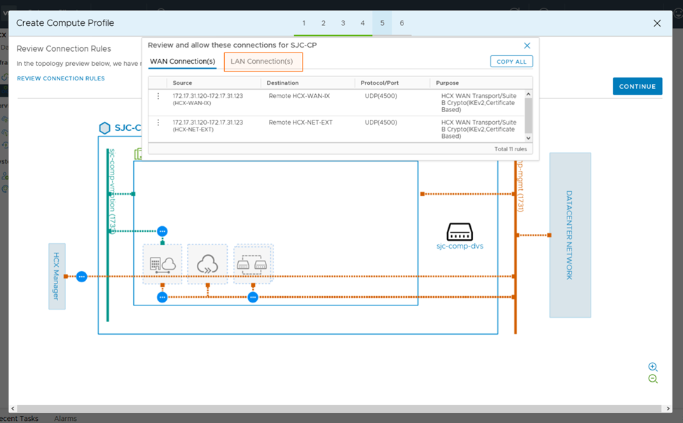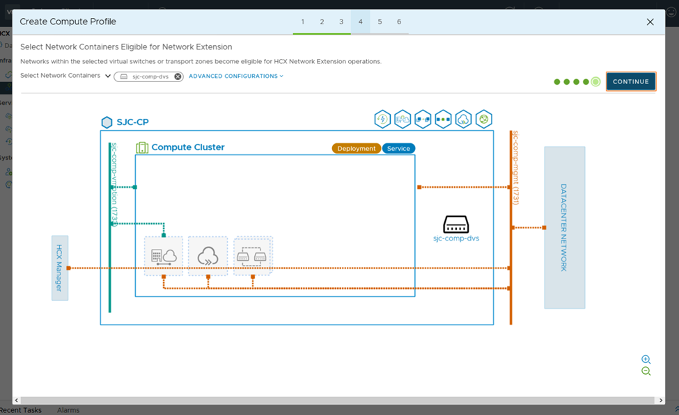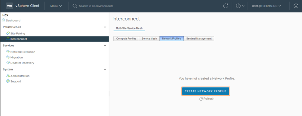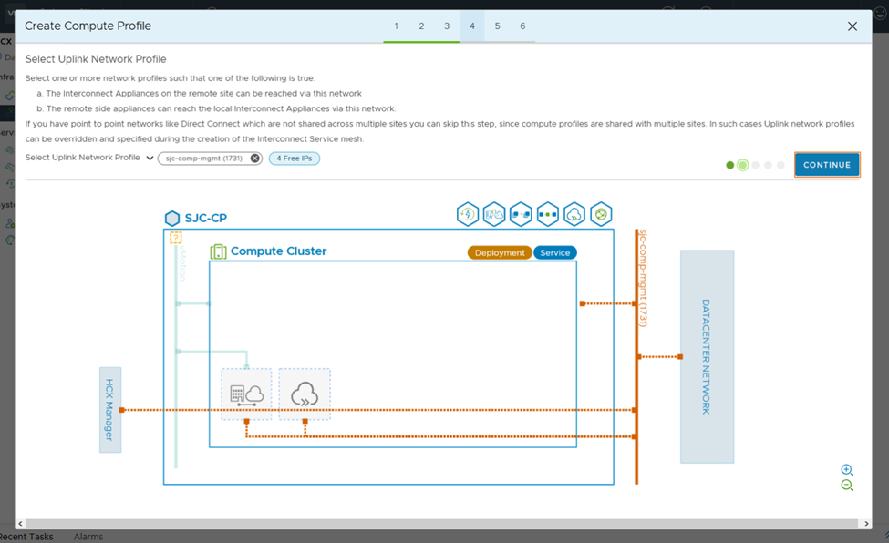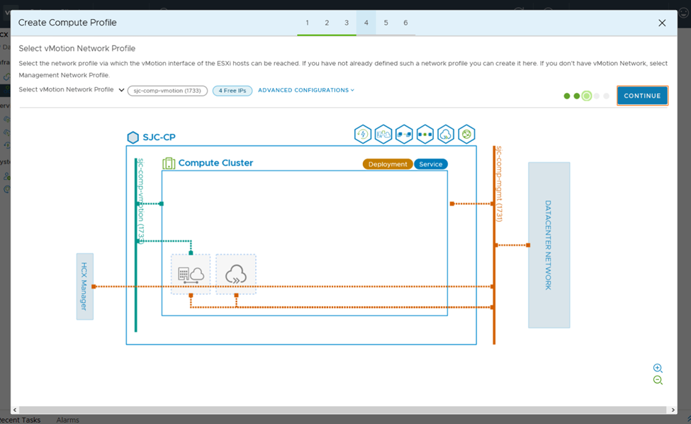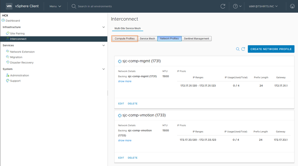 3. In the next steps we need to create Network Profiles for management and vMotion. When a service mesh is created, the network profile configurations are used to connect the deployed HCX appliances.