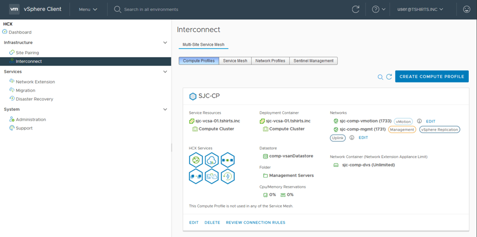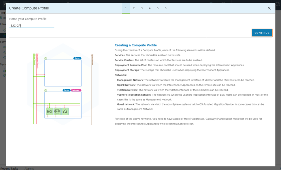 4. We can now proceed to create Compute Profiles. A Compute Profile describes which HCX services run, and how they are deployed when the Service Mesh is created.