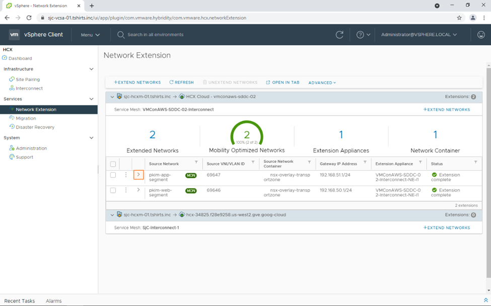 - HCX Network Extension Virtual Appliance: The HCX Network Extension service provides layer 2 connectivity between sites. HCX Network Extension provides the ability to keep the same IP and MAC addresses during virtual machine migrations. When the Network Extension service is enabled on a Service Mesh, a pair of virtual appliances will be deployed: one in the source and one in the destination site.