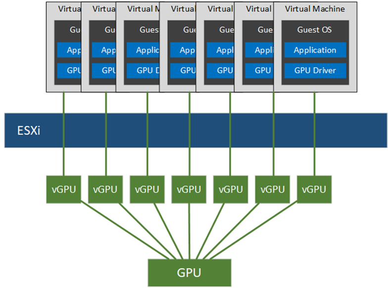 1. Virtualized Mode: When it comes to GPU virtualization, NVIDIA developed the GRID vGPU – a GPU virtualization solution. It allows multiple VMs to share the same physical GPU. It also enables well-known virtualization benefits, such as cloning a VM or suspending and resuming a VM. The NVIDIA GRID vGPU manager is installed in ESXi to virtualize the underlying physical GPUs. The graphics memory of the physical GPU is divided into equal chunks and those chunks are given to each VM. The type of vGPU profile assigned to the VM determines the amount of graphics memory to be consumed.