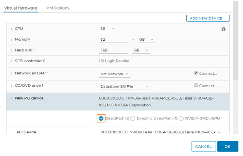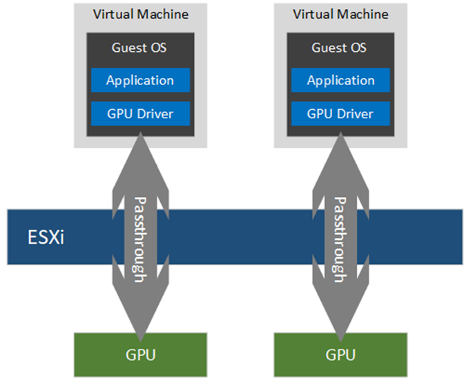 2. Passthrough Mode: Passthrough on vSphere (also known as VMware DirectPath I/O) allows direct access from the guest operating system in a virtual machine (VM) to the physical PCIe devices of the server controlled by the hypervisor layer. With passthrough, each VM is assigned one or more GPUs as PCI devices. Passthrough provides exclusive access of the GPU when you want a VM to have one or multiple physical GPUs for huge computation needs of an applications running inside the VM. Since the guest OS bypasses the virtualization layer to access the GPUs, the overhead of using passthrough mode is low. There is no GPU sharing amongst VMs when using this mode.