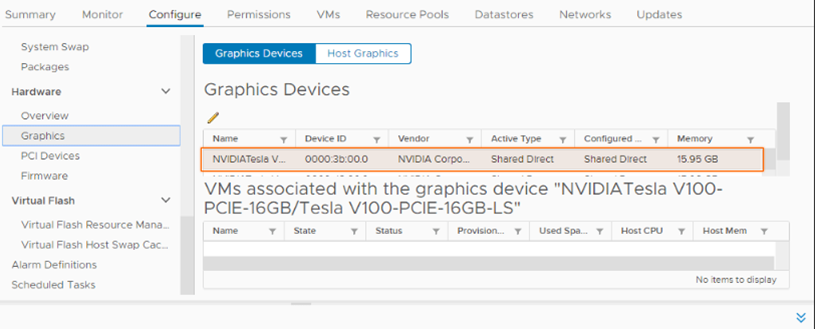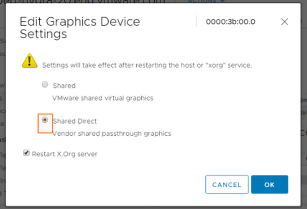- First, we need to configure the GPU settings on the card to “Shared Direct” to allow NVIDA GRID to work.