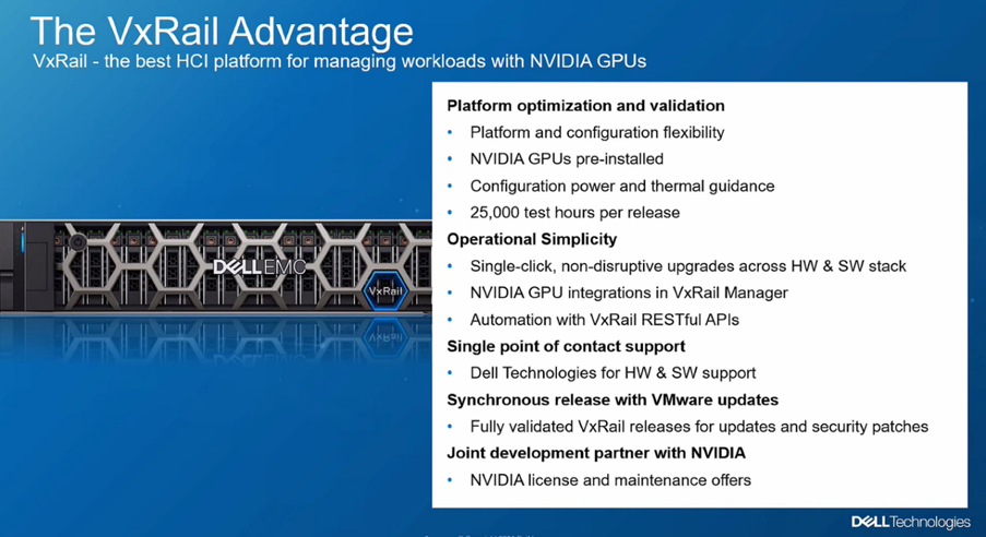 VxRail provides a platform for deploying machine learning workloads. It offers end-to-end support for Machine Learning workloads using vSphere from training to inferencing to managing deployment of machine learning applications. VxRail supports a wide range of GPUs to support machine learning workloads for virtual desktops.