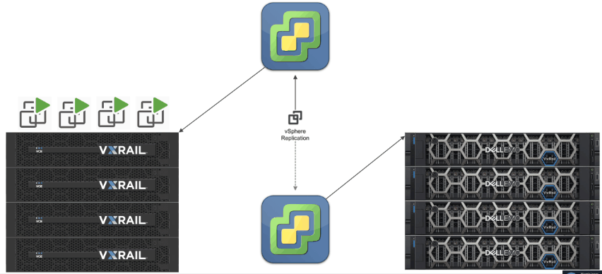 The virtual machine is replicated from the source cluster to the new VxRail cluster using a replication tool. In the diagram above I have depicted vSphere Replication, but this could also be RP4VM (included with VxRail) or any other replication software. Once the data has been staged to the VxRail cluster the source VM is powered off, a final replication is completed to update the destination, then the destination VM is powered on.