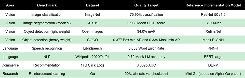 Thankfully, there is MLPerf, an industry-standard performance benchmark system for ML that overcomes related challenges to help fairly evaluate the performance of different DL systems. To do so, MLPerf provides an agreed-upon process for measuring how quickly and efficiently different types of accelerators and systems can train a given model. MLPerf is especially useful and has gained widespread popularity for providing accurate benchmarking results for multiple DL domains, including image classification, NLP, object detection, and more: