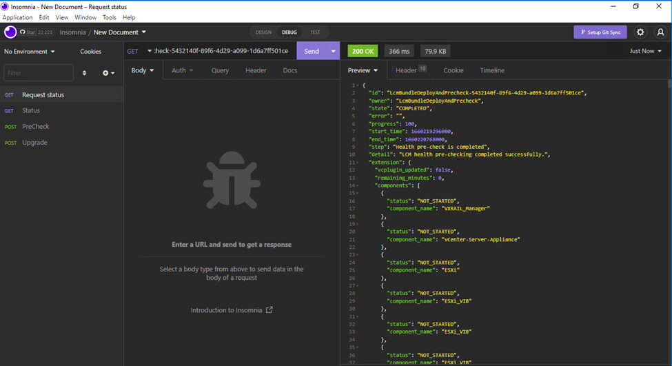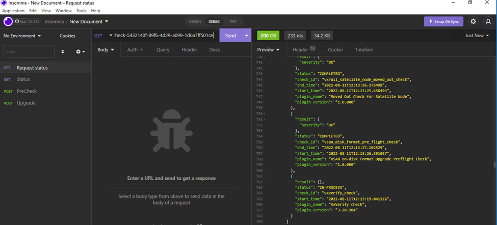 The request id returned from the previous command can be used once again to review the status of the pre-check by executing GET https://vxrailmanager/rest/vxm/v1/requests/idxxx.