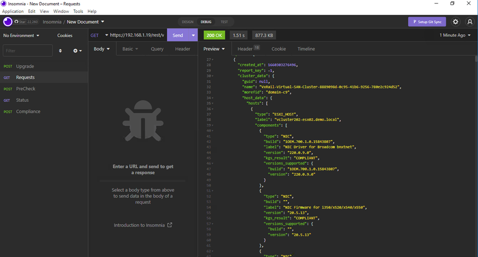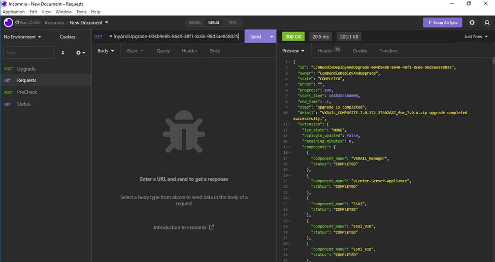 Optionally, after the upgrade you can create a compliance report for a more in depth report on versioning of all sub-components. We use POST https://vxrailmanager/rest/vxm/v1/cvs/compliance-report followed by retrieving the request id using GET https://vxrailmanager/rest/vxm/v1/requests/idxxx – see below for further details.