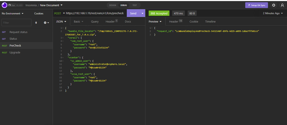 To execute the pre-check, we need to POST the upgrade bundle location and credentials to https://vxrailmanager/rest/vxm/v1/lcm/precheck – see below for details.