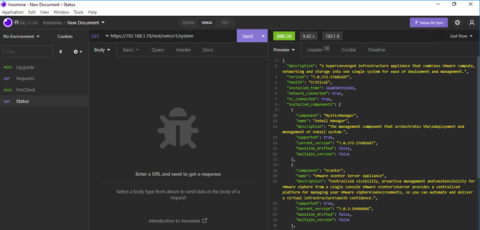Initially we will use GET https://vxrailmanager/rest/vxm/v1/system to retrieve the current software version. You need to use basic authentication using your vCenter SSO credentials. As you can see from the output below, the system is running at 7.0.320.