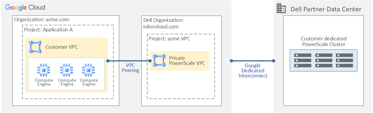 The following figure outlines the architecture of PowerScale for GCP. It consists of three main components – the customer’s Google Cloud organization, Dell Technologies’ Google Cloud organization and Dell Technologies partner data center.