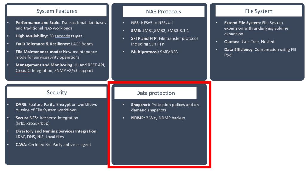PowerFlex File offers customers two options for data protection: snapshots and 3-way NDMP backup (remote backup).