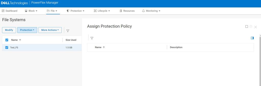 Assigning a protection policy to a file system: Assign a protection policy to a file system Assign a protection policy to one or more file systems to apply the snapshot rules included in the policy to the file systems. The protection policy automatically performs snapshot operations based on the specified parameters. If a protection policy that meets your data protection requirements is available, you can assign it to a file system at any time. You can assign protection policy to a file system during the resource creation or at a later stage.