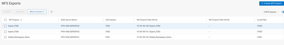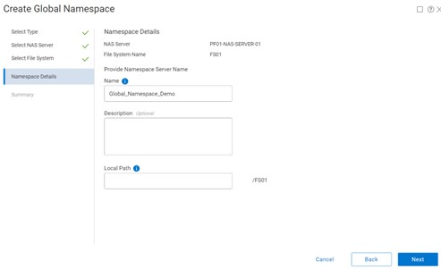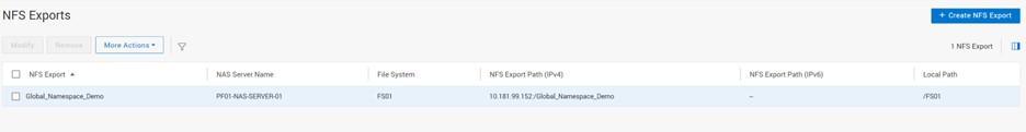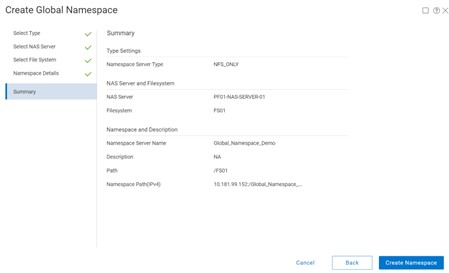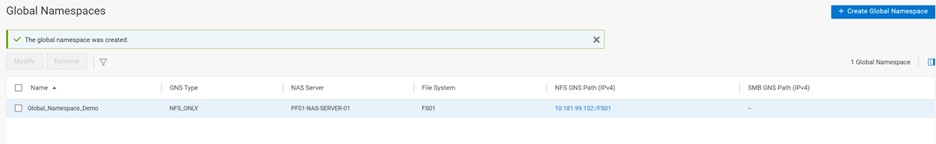 9. Namespace created and displayed. Similarly, file system and export will be created as part of the Global namespace creation process.