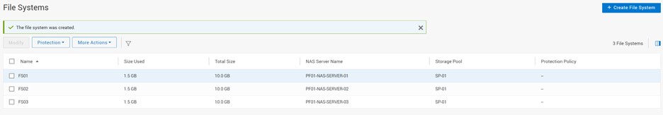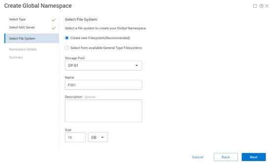 6. With 4.5, the same pool used for Block can be used for file as well. So, proceed to choose the same storage pool, SP-01. Give a name for File system and indicate the size of the file system require. Next.