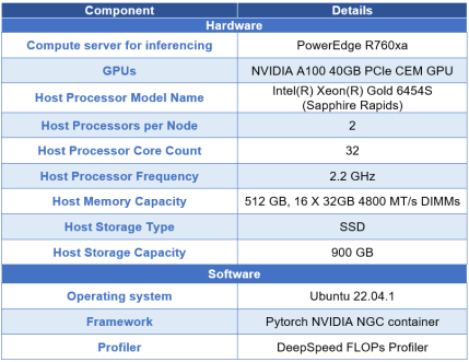Here’s a look at the hardware and software configurations chosen for our customer service assistant use case, as deployed on an R760xa with a single A100 40GB GPU: