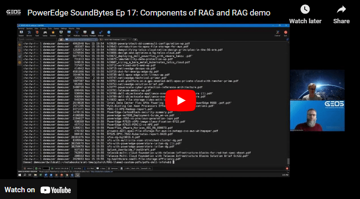 In the first video on RAG, David O’Dell and I cover a quick intro to RAG, aka Retrieval Augmented Generation, why RAG was needed and what RAG is. In this second video, we do a deep dive into the various components of RAG and then David walks me through a Jupyter notebook showing RAG in action on a subset of whitepapers and blogs from the Dell Technologies Infohub repository.