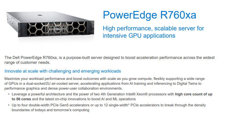 Document(page_content='PowerEdge R760xa\nHigh performance, scalable server for \nintensive GPU applications\n\nThe Dell PowerEdge R760xa, is a purpose-built server designed to boost acceleration performance across the widest \nrange of customer needs.\n\nInnovate at scale with challenging and emerging workloads\nMaximize your workload performance and boost outcomes with scale as you grow compute, flexibly supporting a wide range \nof GPUs in a dual-socket/2U air-cooled server, accelerating applications from AI training and inferencing to Digital Twins to \nperformance graphics and dense power-user collaboration environments.\n\n• Leverage a powerful architecture and the power of two 4th Generation Intel® Xeon® processors with high core count of up \nto 56 cores and the latest on-chip innovations to boost AI and ML operations\n\n• Up to four double-width PCIe Gen5 accelerators or up to 12 single-width* PCIe accelerators to break through the density \nboundaries of todays and tomorrow’s computing')