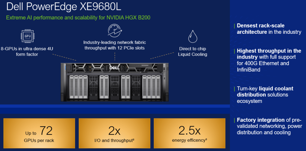 The PowerEdge XE family of servers has been leading the way in providing the necessary computing power to utilize generative AI for customer applications. Dell Technologies have announced support for both the B100 and B200 models and have taken into account customer feedback about the need for top-tier performance while also improving cooling and power requirements as generative AI becomes more widespread within organizations. The XE9680L sets a new standard for performance and energy efficiency in a more compact, denser 4U form factor, complete with an HGX 8-way B200 GPU configuration. To close, here are some key features of this design: